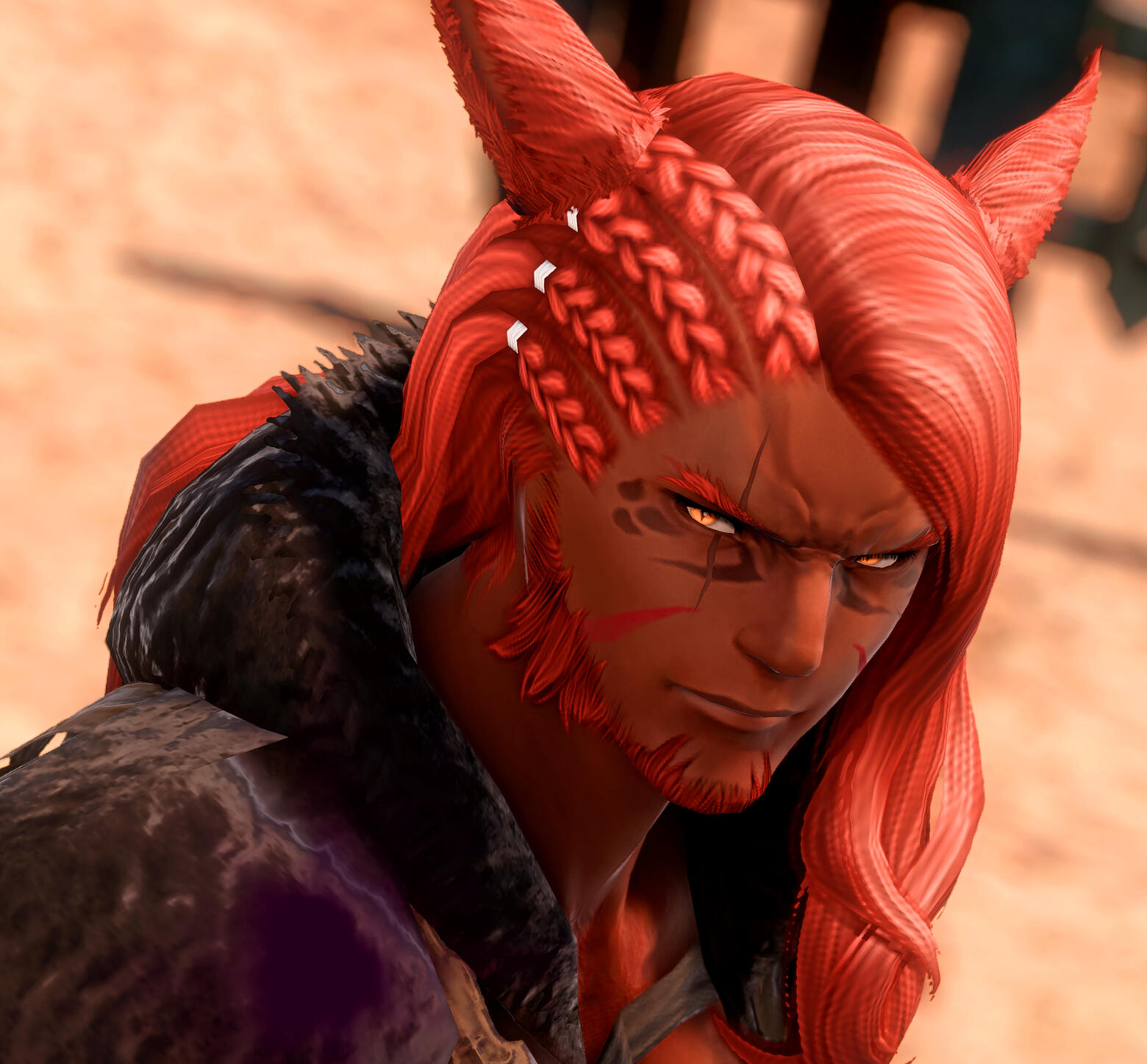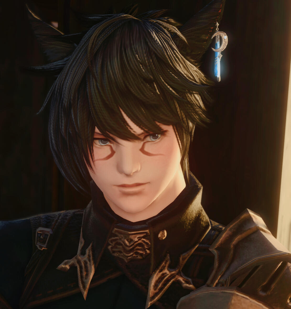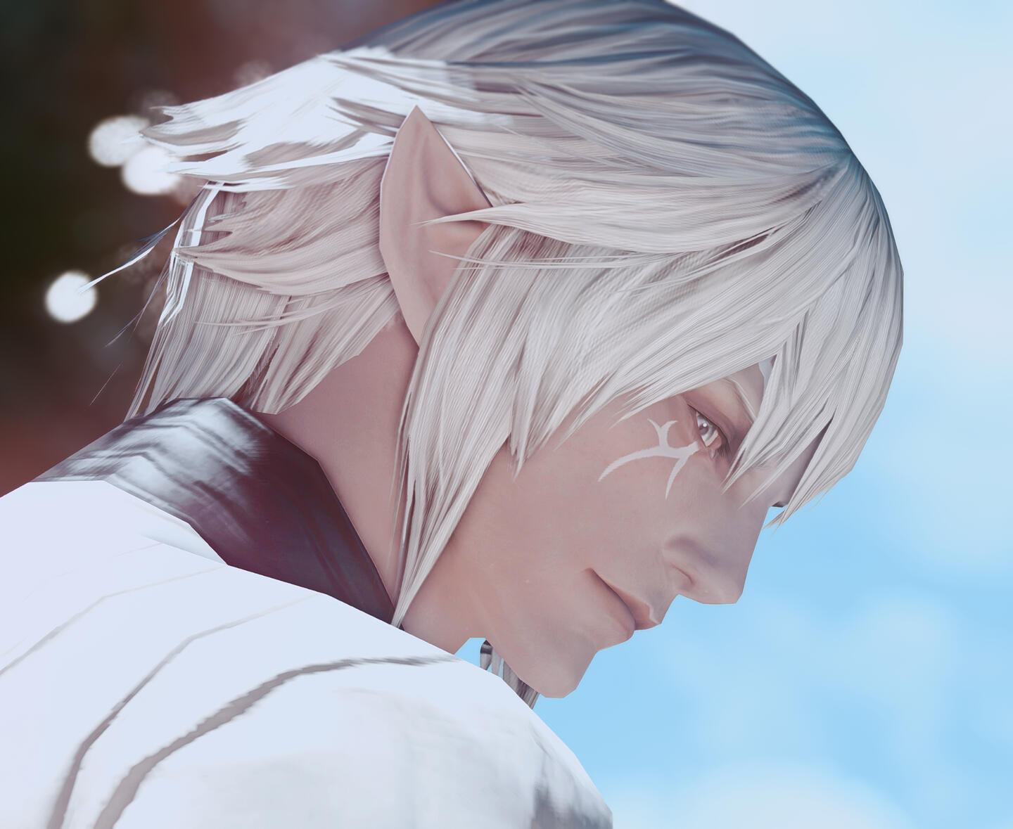 BODILY FEATURESThis man's body is covered in countless scars and cuts. Although most of them are usually hidden by clothing, some are visible nevertheless. Rarely did this man bother to visit a healer and therefore let his wounds fester and heal over time. Naturally all of them originated from various life situations and battles. Wenarian's hands and arms are scarred most heavily due to the constant use of the bow... and fists.Wenarian appreciates aesthetic appearances in others but has a rather realistic (and almost indifferent) perception of his own looks. Any material, be it stone, wood or iron will find its end one day or another. Flesh is not spared this fate. Thus cars never bothered this man and subsequently he had never tried to hide them in shame. If anything, heh, the look of some scars could cater for an interesting story or a lady's interest!There are two scars on Wenarian's body, however, which he is fairly nostalgic about. One of them is a deep cut on the left side of his lower jaw. It stretches along the jawline and crosses the lower part of his cheek. Surviving the streets of Ishgard as a young boy, Wenarian got caught stealing and earned this scar from a powerful kick of a guard's metal plated boot. By sheer luck the boy's jaw didn't get dislocated and he survived the powerful beating. No Ishgardian knight had ever been 'kind' to thieves, ay? Thus did Wenarian give himself a promise, to never be kicked like this in the face ever again.The second scar is of a magical nature. This one resembles a long, burned mark stretching along his lower right arm. So far this is the only injury caused by black magic. This very magic lays dorment and encapsulated within the male's aether, occasionally causing Wenarian discomfort and reminding him of the dangers of black magic. It was his former husband's spell, which scarred the Seeker in the days prior to them being a couple.EYE MARKINGSThe striking red markings, which stretch from the edges of the male's eyes, trace back to the lineage of Wenarian's father. The male ancestors born with such extravagant markings were destined to became the tribe's next Nunh. Wenarian had made the decision to stay tribeless and chose a life of an adventurer over his lineage. But some say the blood of a trueborn Nunh undeniably pulses in his veins.