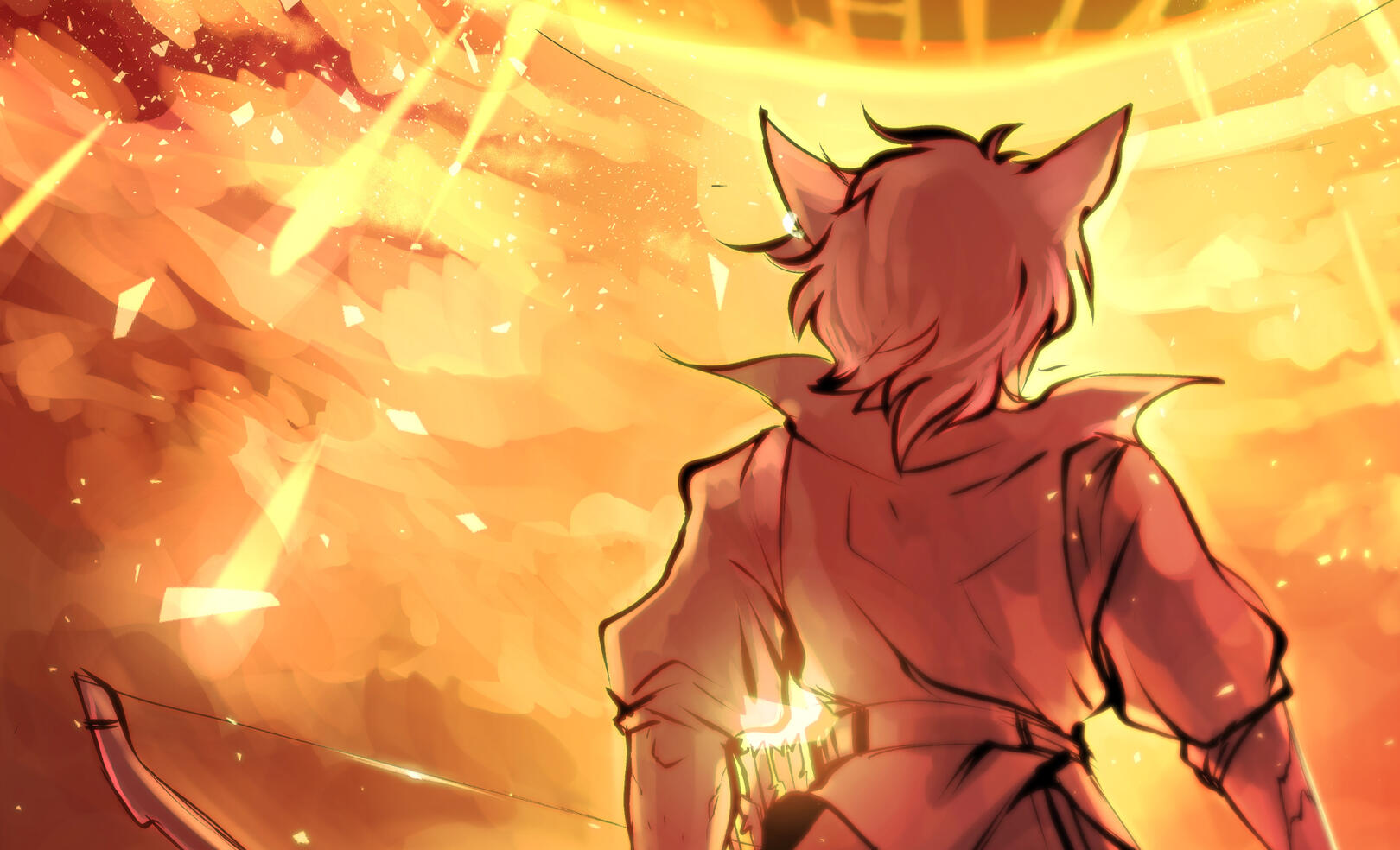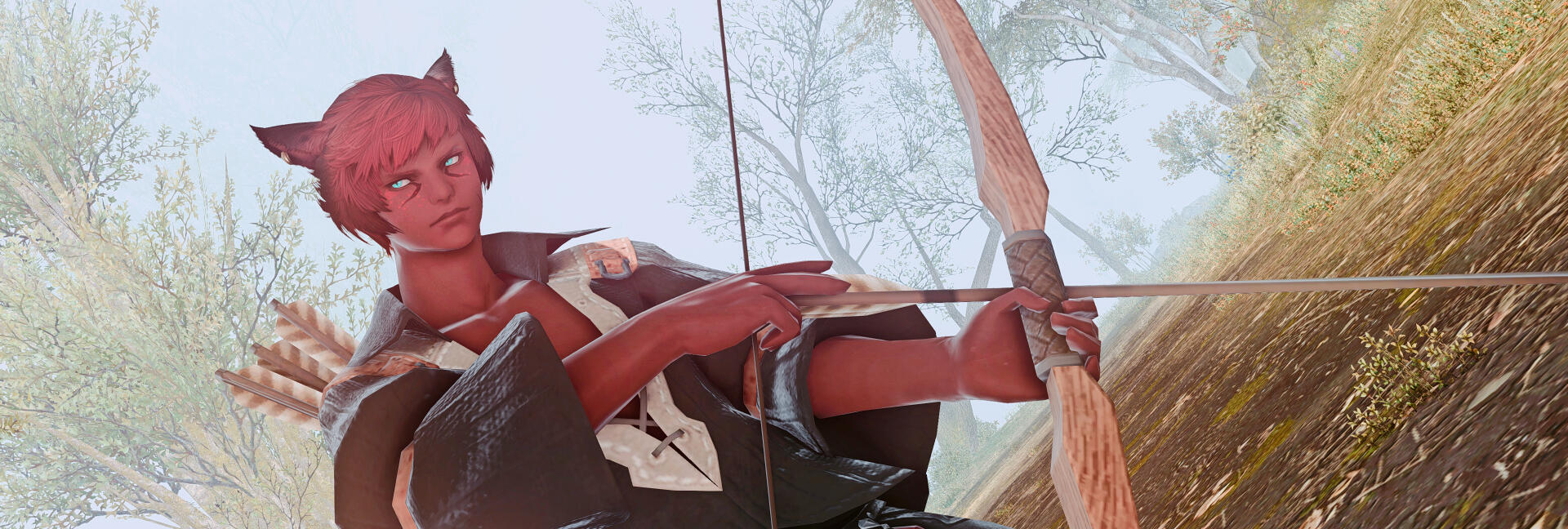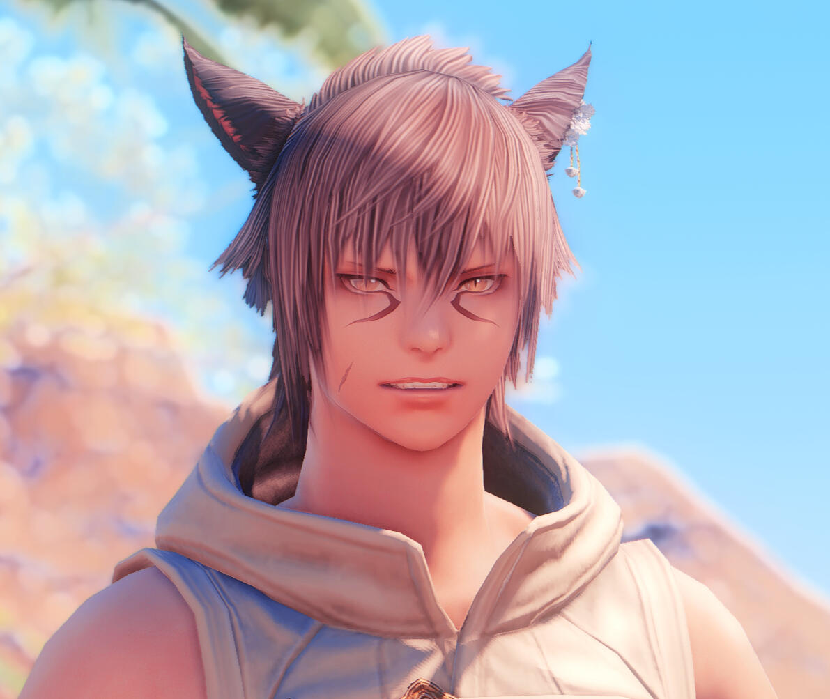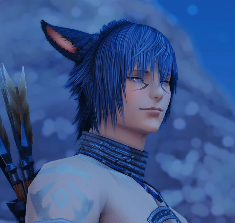 Wenarian kept on living his life after parting ways with Silent Snow. For a few years in a row, he was riding with traders from various caravans; exploring the continent was his main goal. He had no particular destination in mind. Wenarian’s journeys took him as far as the Sea of Jade. It was around that time that one of the most fateful meetings had happened, slowly but steadily turning his life upside down. He started courting a male of his utmost interest, an Elezen named Aygun.To be honest, Wenarian wasn’t known as a man sharing interest in other males. Quite on the contrary even! But there was something about Aygun, which the Miqo’te simply couldn’t ignore. Skilled in dark arts and aether manipulation, Aygun was the complete opposite of the bard. And people do say that the opposites tend to attract each other...Well, if that was the case though, then the affection was most certainly one-sided! For it was Wenarian’s path of trial and error to walk towards a man, seemingly cold and disinterested in anything but magic. Eventually, as annoying as his ceaseless flirtations could be, the pragmatic Aygun did find him to be a dependable resource. A companion worthy enough to stay by his side for the time being. Since Wenarian’s travels took him all over the world, he was able to find all manner of things, such as exotic materials, alchemical reagents and other items the Blackmage could possibly need. And the Seeker would never disappoint (Author's note: Wenarian would return sometimes injured, sometimes drunk. Sometimes both). He did return and he would always have what Aygun had asked for.It was this dependability that led Aygun to believe in Wenarian and his ability to assist him. However at this point in Aygun's life, Wenarian was useful... but otherwise very uninteresting. Wenarian grew greatly but this growth would, like many good things, take time. The two companions would delve through the depths of ruins and dungeons alike. Aygun knew that Wenarian would be able to provide the needed support in any battle... when he was not goofing off! But jokes and flirtations aside. Just as he had been described amongst the Quiver, when it came to his work - the Seeker certainly knew how to focus and was very dependable.Yet Wenarian could not catch Aygun's attention. Despite the hopeless seeming outlook, the bard never gave up. Not even once! It was a year before the Battle of Carteneau Flats and the Descent of Dalamud, that Wenarian would become too bold in his attempt to cross certain boundaries... and with that he earned the Blackmage's ire.It was that day, that he dared to steal a kiss without Aygun's consent. Not wishing to reduce the cheeky Seeker to ash right away but wanting to teach him a good lesson, the Elezen unleashed black magic upon him. A powerful bolt which struck the male's arm was a well-deserved punishment, a price he paid for his advances. Aygun never expected to see Wenarian again after that as the latter left injured.However, that same day Wenarian had also earned Aygun's earnest attention. Not for the kiss, of course, but for his return. Burned by a Black Mage and scorned as a lover, would’ve discouraged many individuals. So the Elezen was pretty astonished to find the Miqo'te back at his doorstep, with that same goofy smile and a crude bandage around his newly earned burn.From that moment on, Wenarian continued much as he was; laughing, telling jokes, making racket with his music as if nothing had ever happened. Save for one major change. Wenarian never again broke Aygun's boundaries or made a new bold attempt. Never again did he do something, which his companion could consider to be ‘disrespectful’. And for the first time, Aygun started noticing more about the Seeker.Wenarian had seen twenty-three summers come and go, when the Seventh Umbral Calamity took place. All men, capable of fighting, have been called to arms by the City-States throughout Eorzea. Both Wenarian and Aygun had ventured to Carteneau Flats to assist their respected Alliances in fighting the Garlean Empire's invasion.Watching Dalamud descend upon the planet's surface was a dreadful sight for friend and foe alike. When Dalamud burst open, releasing the elder primal Bahamut from his captivity, his infernal wrath was unleashed upon the entire Realm. The ground shook, the cities vanished in flames. Wenarian would never forget the fear seizing and suffocating him, angst crawling down his spine as he lifted the gaze towards the burning heavens.A single fleeting moment was needed... to understand and feel how petty the worldly concerns of people were, compared to such an inavoidable disaster. A great catastrophe, which would put an end to everything he knew. Mark an end to the stories of everyone he held dear. A disaster which, according to the Scholars of Sharlayan, had devastated the world repeatedly and rendered all known... to ashes six times before his own era.This was, what they called a Calamity.The dreadful realisation of one's presence being meaningless, given the overwhelming scale of the conflict... Facing the inevitable devastation and demise of allies and foes alike... Watching people burn, machines clash, metal srape, flesh being torn by spears and bullets... These images, Wenarian would never forget.Yet hearing the shouts of agony and watching people flee and retreat in overwheling fear... made the Seeker's hand grab his bow and quiver tightly. The grounds around Wenarian oozed with the scent of burnt flesh and melting armor. He saw no point in running. But he didn't blame the many around him who did.With the fire raining from the sky, there was no place for anyone to hide. No point in even trying. No a single spot upon Eorzea's continents would be granted any kind of salvation... now would it? And so amids the heat of the battlefield, Wenarian pressed on, fighting until his last breath.If that was the last thing he ever did... he could be selfish. This one time!He wanted to ma