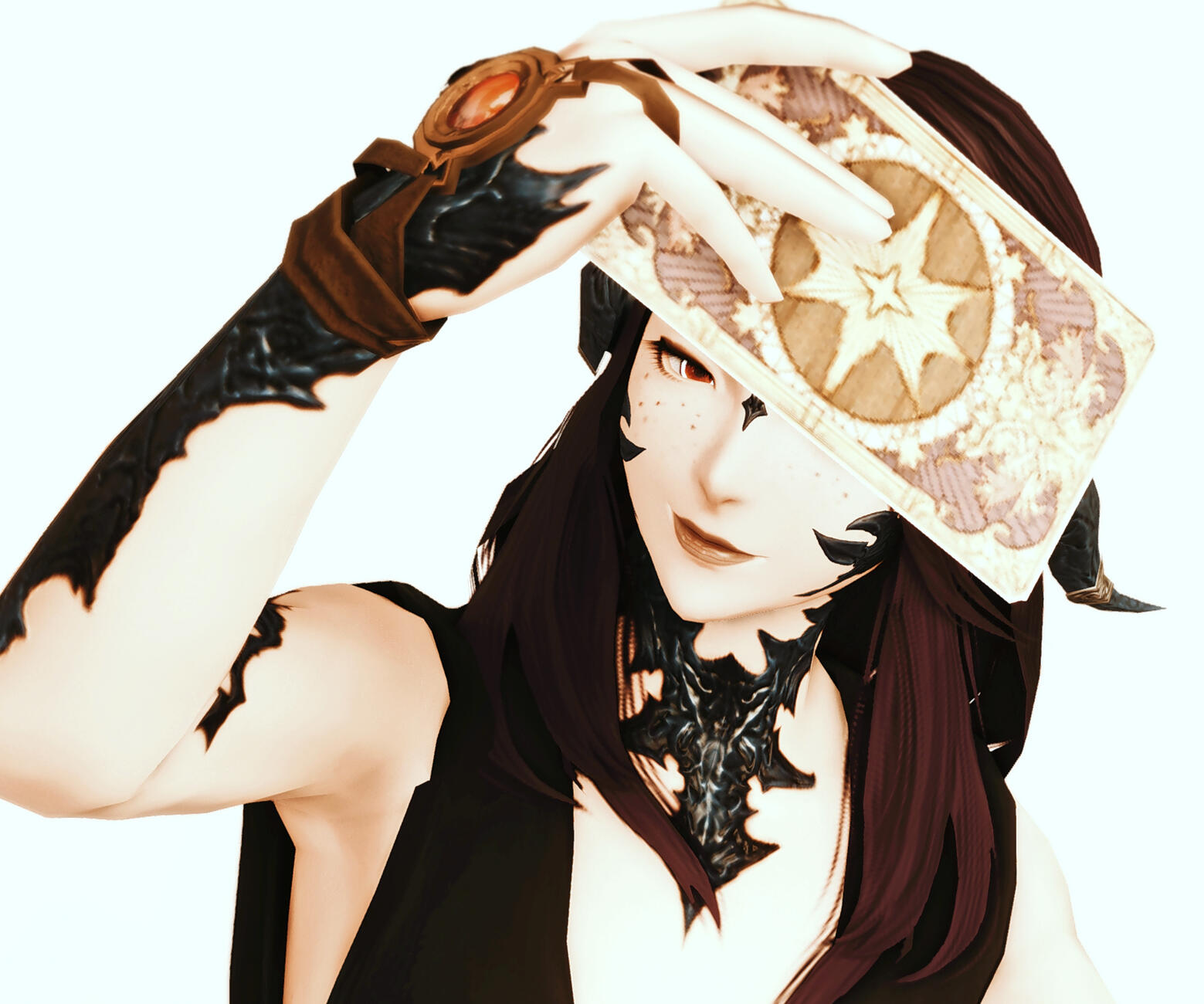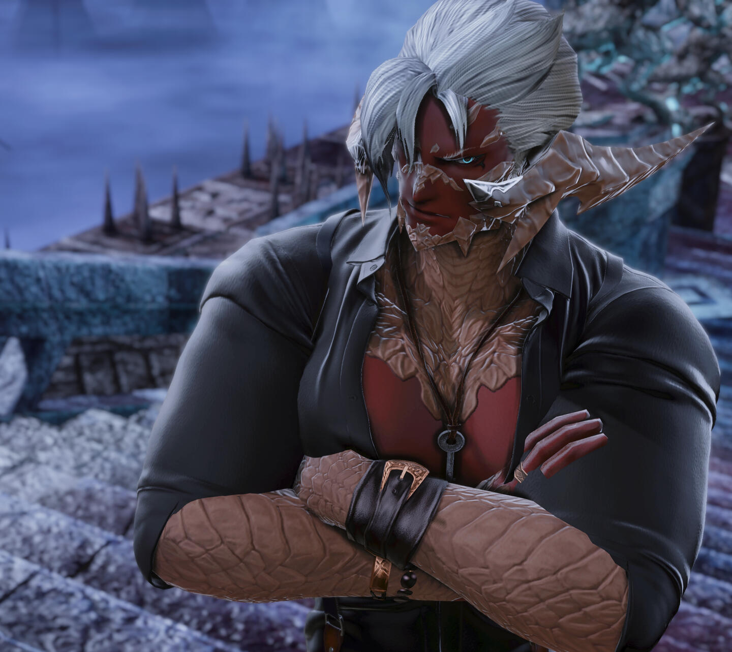 "Oh what a beautiful and fair lady, this young Xaela is! Her gorgeous hair is always well kept, the curls are covering the shoulders playfully. The lustrous black scales gleam softly, the graceful movements often make me think of a descendant of royal heritage. Mayhap this is true...? Unfortunately Fafnir claims not to remember anything about her past. And knowing how sensitive this topic can be, I considered not venturing into these waters.I can clearly see why N'oah, whose girlfriend Fafnir is, speaks so passionately about this particular Xaela. I do not doubt his words in the slightest, hah!Fafnir's look is calm, yet can turn cold and become fierce if something doesn't go according to plan. I can clarly see the Dusk Mother Nhaama within her.Her compassion and curiosity makes her an excellent healer. I have gained the pleasure to observe her perform in the role of an Astrologian. Mayhap one day the cards will be able to help her reveal the secrets of her own past..?"